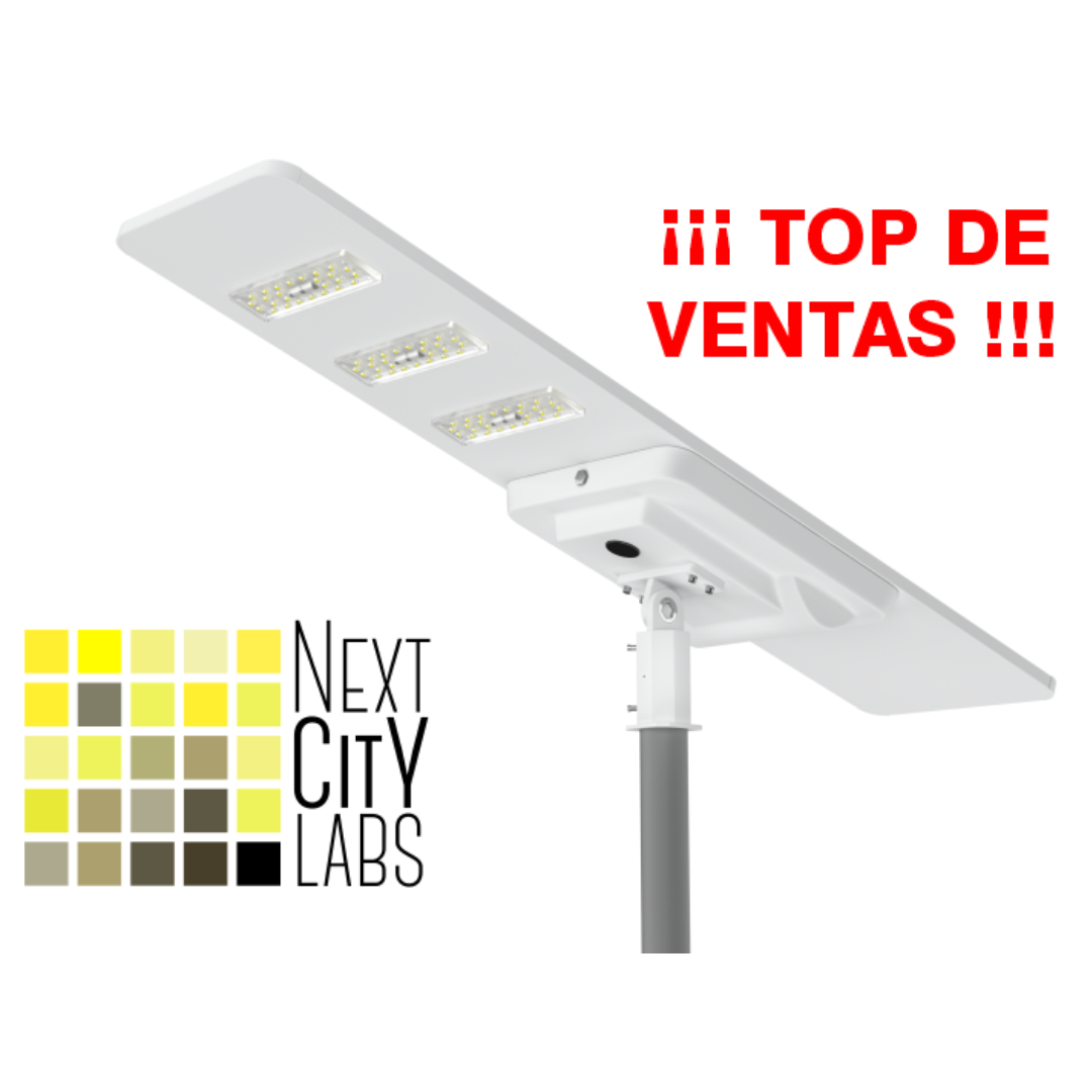 Disponible en potencias desde 30W hasta 120W, de diseño elegante en aluminio, panel solar monocristalino de 23% de eficiencia, batería de LiFePO4, eficiencia de 200lm/W, IP66 / IK09, fotometrías diversas, sensor de movimiento y 5 años de garantía.