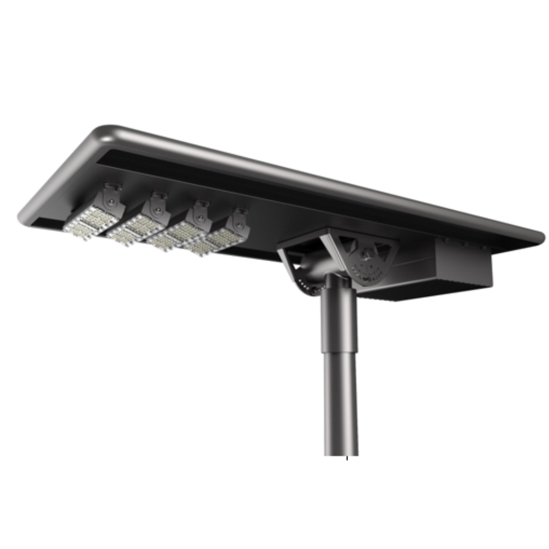 Cuerpo de aluminio robusto y alta resistencia. Panel monocristalino de carga rápida de hasta 120W, potencia de modulo LED de hasta 80W. Batería LiFePO4, con fotosensor, control PIR/microondas. Control remoto para programación por etapas, eficiencia de 180 lm/W, flujo luminoso de hasta 14400 lm y CCT desde 3000K hasta 6500K.